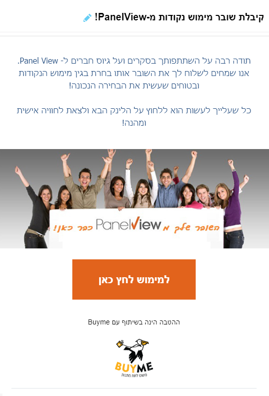 תודה רבה על השתתפותך בסקרים ועל גיוס חברים ל- Panel View. אנו שמחים לשלוח לך את השובר אותו בחרת בגין מימוש הנקודות ובטוחים שעשית את הבחירה הנכונה! כל שעלייך לעשות הוא ללחוץ על הלינק הבא ולצאת לחוויה אישית ומהנה!