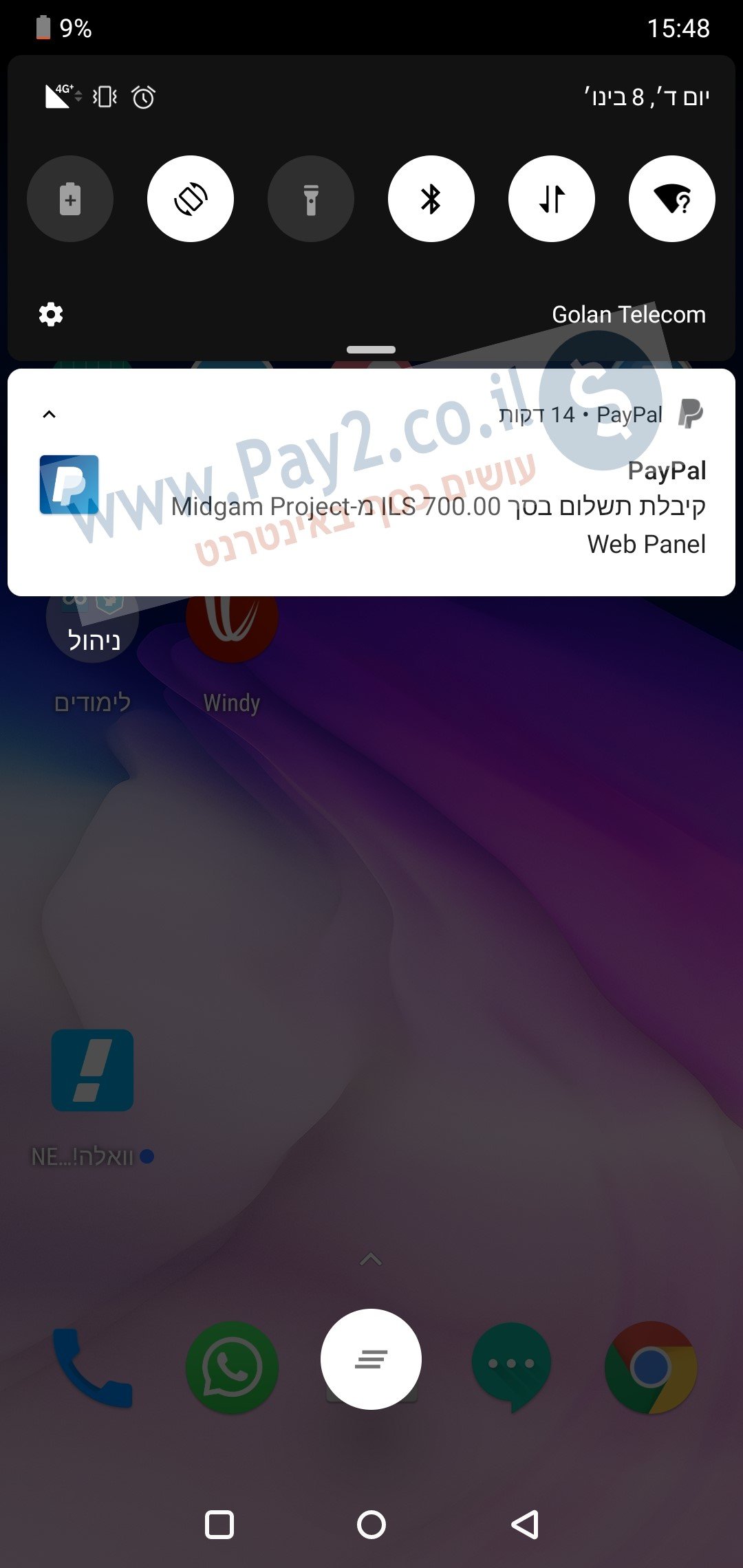 הנה תמונות מהפלאפון שלי בעת ההודעה על קבלת הכסף ב-paypal: